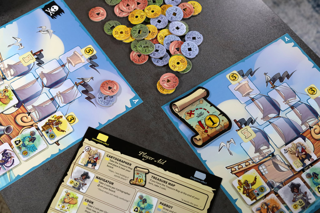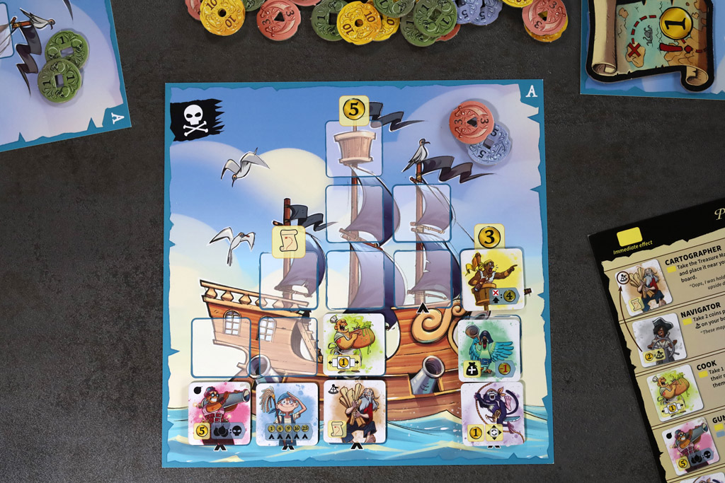 You resolve the effects, grab some coins, and pass the bag. It’s fast. Like, “don’t look at your phone or you’ll miss your turn” fast. Everything comes down to the coins. The richest captain wins, and the Treasure Map acts as the ultimate tie-breaker. Simple, right? Well, until you meet the crew.