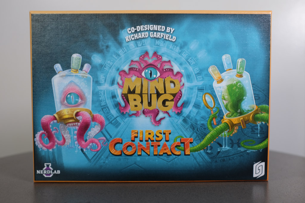 Mindbug: First Contact hit our radar due to a history of loving two player combat games. Introduced as a shorter/faster version of TCG battles, Mindbug is a two-player card game designed by Richard Garfield, Skaff Elias, Marvin Hegen, and Christian Kudahl and released in 2022. The design removes traditional deck construction and resource systems while retaining the core of combat, abilities, and life totals. The result is a competitive card game built around immediacy.