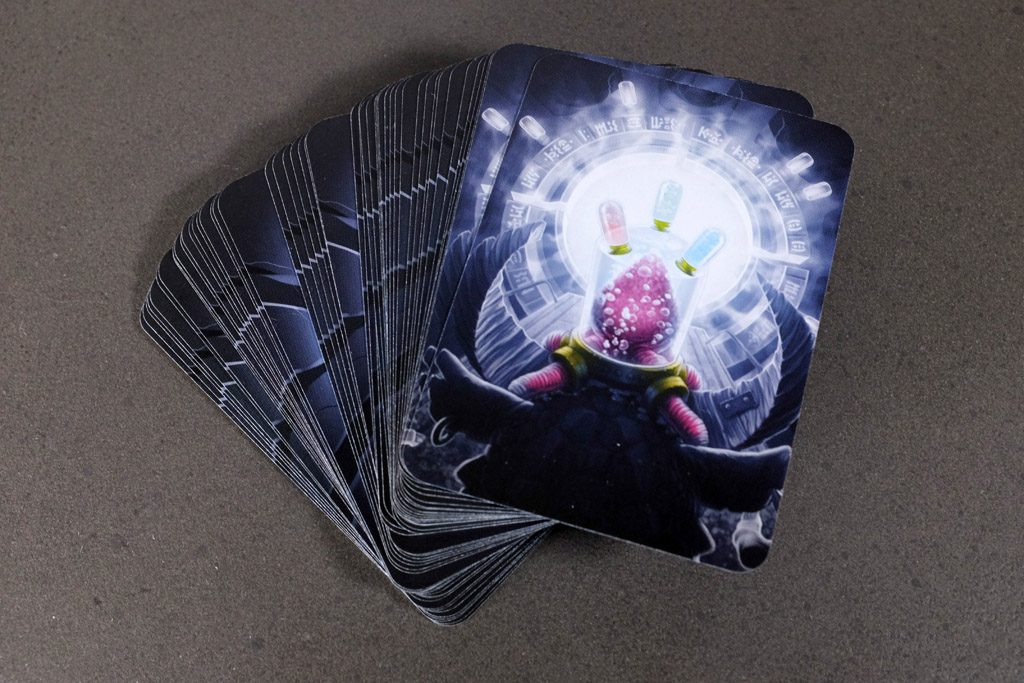 Each game uses a single shuffled deck of creature cards. From this deck, each player receives ten cards: five in hand and five placed face down as a personal draw pile. Players also receive two Mindbug cards and use trackers to monitor their three life points. Setup is brief and identical every time, ensuring that the focus remains on tactical play rather than pre-game preparation.