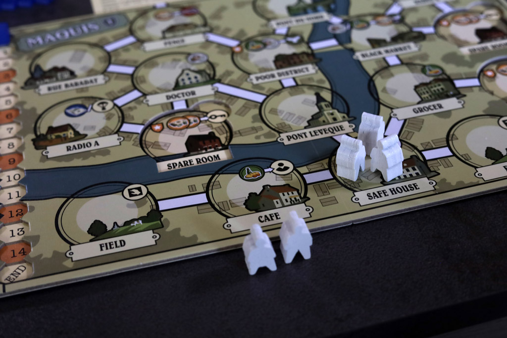 After a worker acts, you must trace an escape route along roads back to a safe house, using only empty spaces or spaces with other Resistance workers. Patrols block that route.