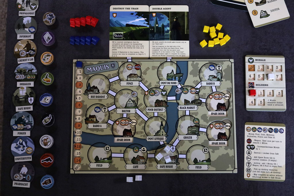 Maquis is an elegant 20-minute worker-placement game about staying alive long enough to win. The game is designed as a solo experience that puts you in charge of a French Resistance cell in World War II, operating inside an occupied town where every action risks an arrest. Designer Jake Staines first released it as a print-and-play title in 2013, where it became a standout in BoardGameGeek’s Solitaire Print and Play Design Contest scene. Side Room Games later published a boxed edition in 2019, then expanded it with a 2nd Edition that adds new missions and resources while keeping the core structure intact.