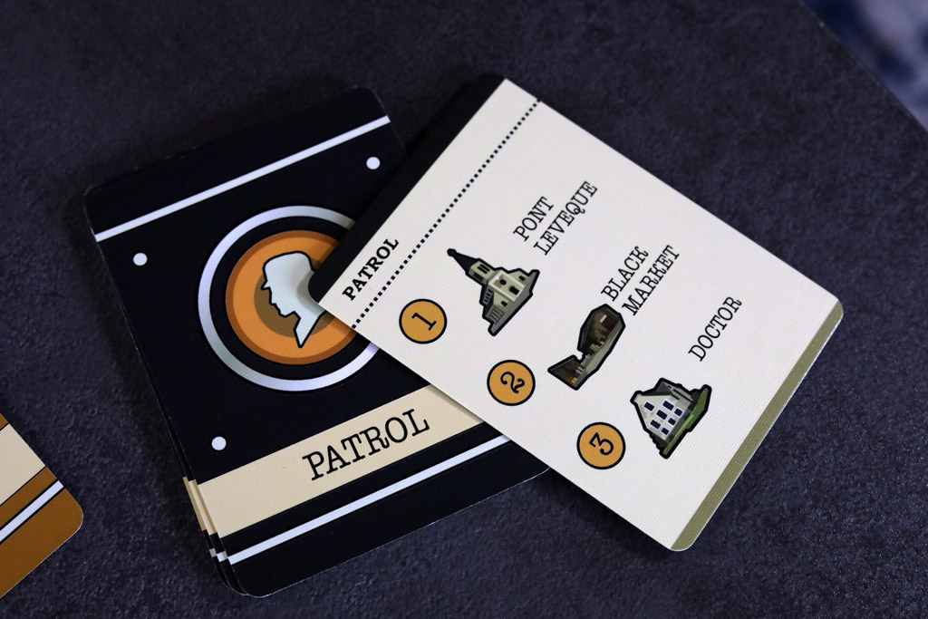 The key mechanical idea: you and the occupation alternate placing workers and patrols (worker first), with patrols drawn and positioned from a deck of cards. When your workers finish an action, they still need a safe route home. A worker who can’t trace a clear path back to a safe house gets arrested and leaves the game for good.