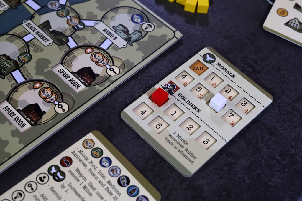 Set up the boards and tracks. Put the day, morale, and conflict cubes on their start spaces. Shuffle the 10 patrol cards into a face-down deck.
