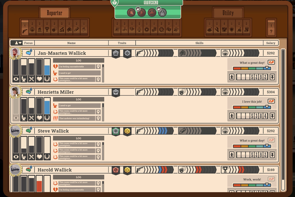 Story Gathering: You dispatch a fleet of specialized reporters (covering genres like Crime, Politics, Society, and Sport) across a map of New York and the globe.