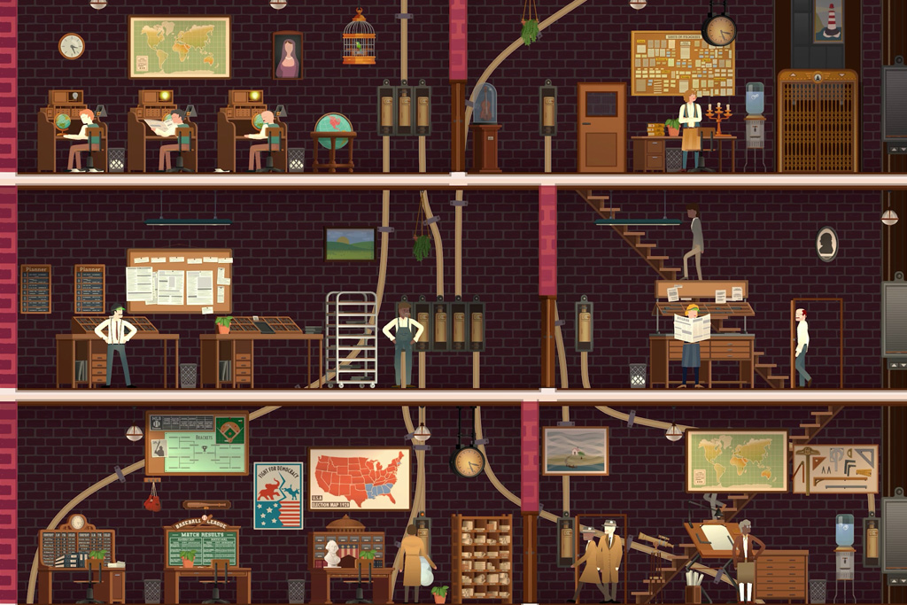 Tower Optimization: Layout is critical. You must balance efficiency against employee well-being. Printing presses are loud and hot; placing them too close to your writers will tank their morale. As the tower grows, you implement pneumatic tubes for speed and elevators to ferry staff between the bustling floors.