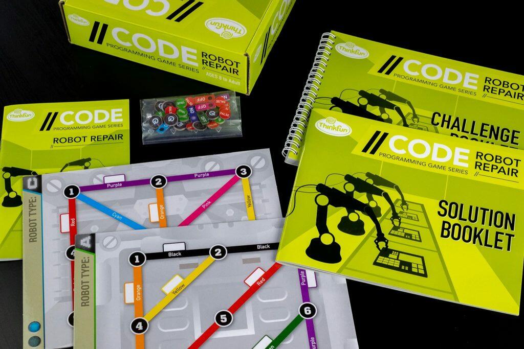Robot Repair is a puzzle game created by Mark Engelberg and published by Thinkfun as part of their //Code series of games. The //Code games can be played solo or multiplayer and aim to teach programming concepts and boolean logic to children (or adults) aged 8 or older. We previously played, enjoyed, and reviewed Hacker by ThinkFun so when we saw Robot Repair we were eager to try it with our 8 year old son.