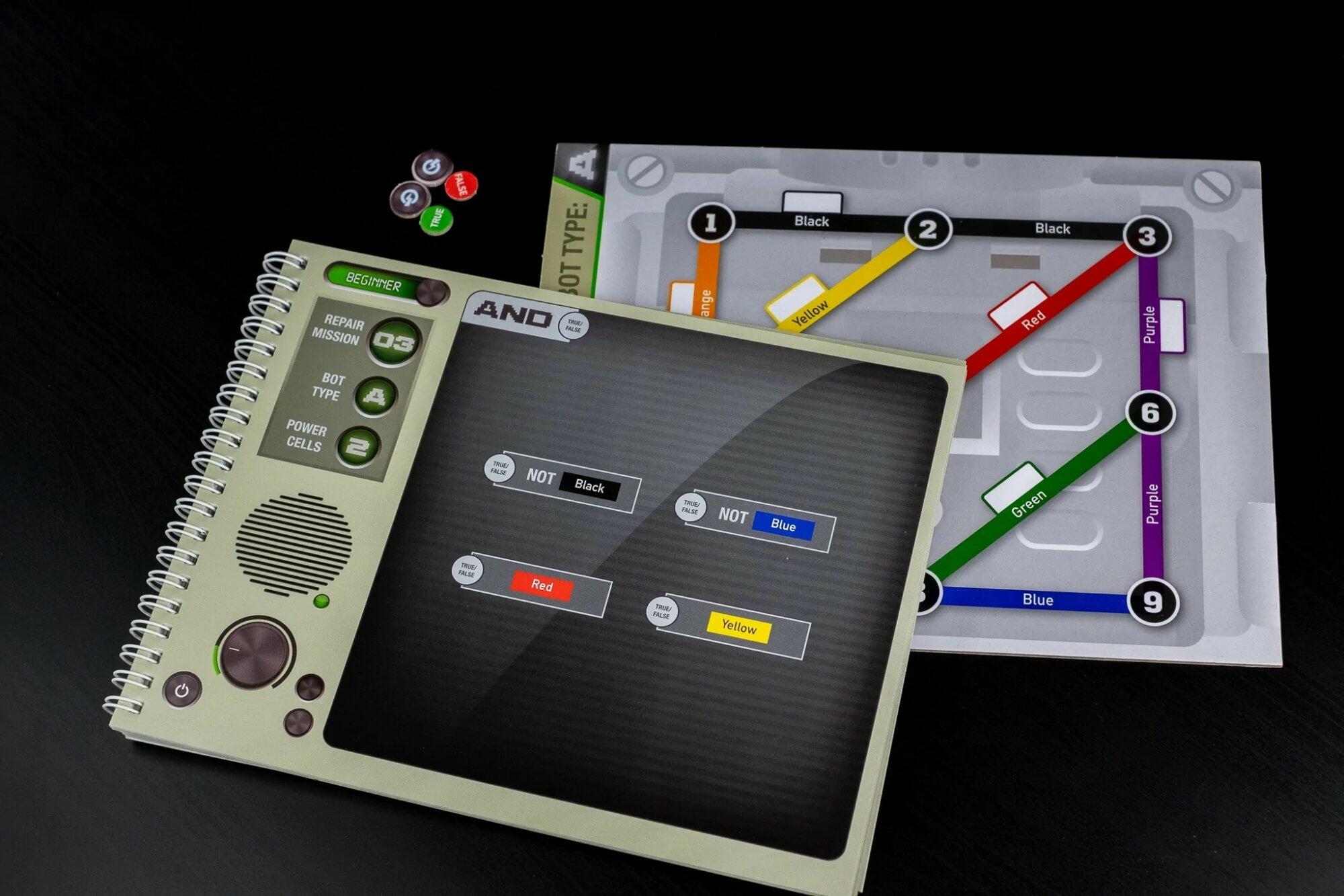 While taking inventory of all game components and pieces, the instruction manual for Robot Repair shows 4 circuit boards, when in reality there are only 2 double-sided boards. It is mildly confusing, but not a showstopper. The challenge booklet is made for durability. In contrast, the solution booklet a simple booklet without binding; it is not difficult to take an accidental glance at the solution for the next challenge on the neighboring page, though. Players, especially the young ones, will need to practice self-control from cheating. Game tokens are double-sided and made out of thick cardboard. They are a bit flimsy to handle and easy to lose. Consider using a small zip-lock bag to keep all the tokens together.