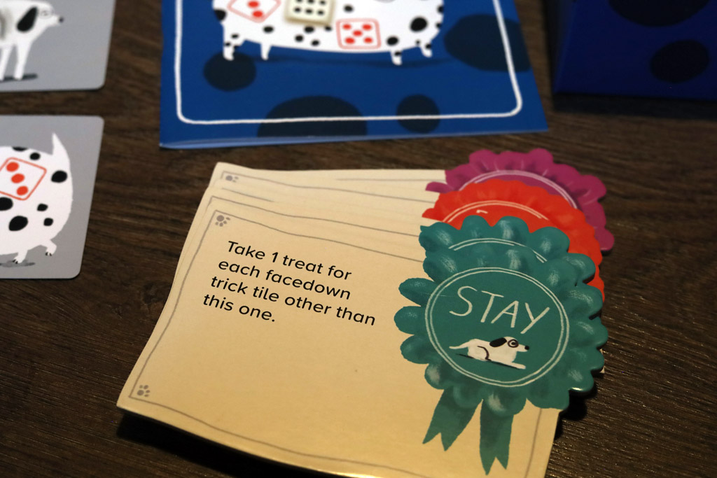 On your turn, you choose one of two actions: do a trick or score your dogs. Most turns start with a trick tile. You pick a faceup tile, flip it facedown, and follow its steps in order (some steps let you repeat them if you want to keep pressing).
